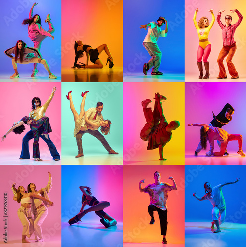 Dynamic collage. talented young people dancing in different contemporary and retro styles against gradient multicolored backgrounds. Concept of contemporary dance style, youth, hobby, action. Ad