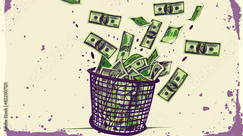 dollar bills flying out of a trash bin against a pink background. The concept symbolizes wasting money or financial loss