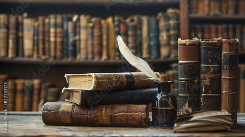 Old books quill pen and vintage inkwell in old library Conceptual background on history education ancient literature topics Old Books are symbol of knowledge Retro style : Generative AI