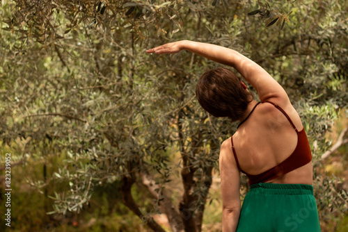 the girl makes side bends in nature, the girl is engaged in sports and somatic exercises in nature