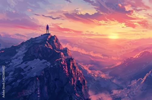 A person standing on top of the mountain, overlooking the beautiful scenery below them at sunrise