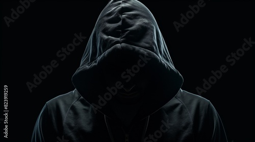 Faceless man in hoodie standing isolated on black, concept of hacker, thief, dark demon, mysterious creature, Halloween character, secret.