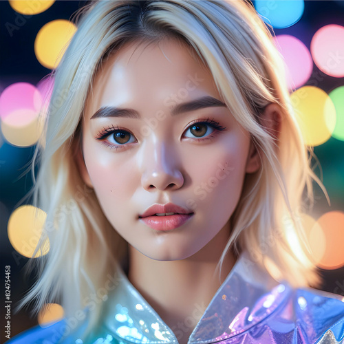 Koncepcja piękna kobiety w kulturze azjatyckiej. Blondwłosa azjatycka kobieta z nieskazitelnie gładką skórą i niebieskimi oczami. Nowoczesny kanon piękna. Kolorowe tło z efektem fotograficznym bokeh