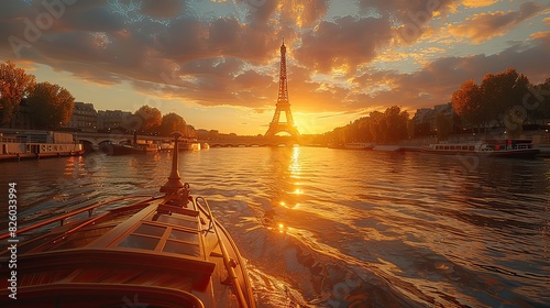 Eiffel Tower from a boat on the Seine, sunset glow, 3D illustration, realistic textures