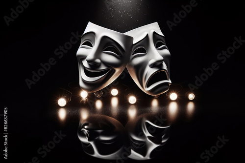 Comedy and tragedy masks reflecting joy and sadness Isolated on black background spot light