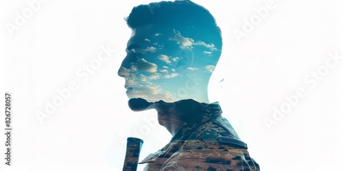 Soldier figure merged with battlefield scene, isolated on white - defense, courage, patriotism