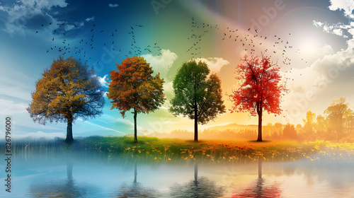 Piękno Czterech Pór Roku: Kolorowe Drzewa w Urokliwej Ilustracji
