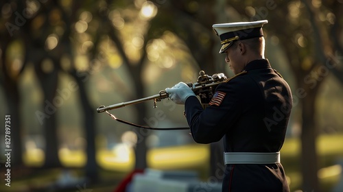 A poignant moment unfolds as a Marine plays taps honoring a fallen veteran with a solemn salute marking their internment at a national military cemetery : Generative AI