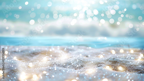 Serene beach sands beneath a light blue sky, lit by soft bokeh lights.