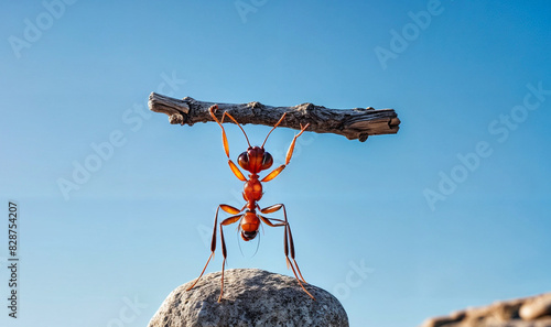 3d illustration render of an ant balances on a rock, holding a branch over its head