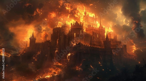 A dramatic scene of a burning fortress, intense flames and smoke, Apocalyptic, Dark, High Detail