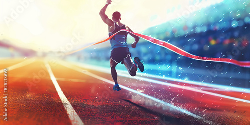 A determined runner crosses the finish line, arms raised in triumph as they celebrate their personal best