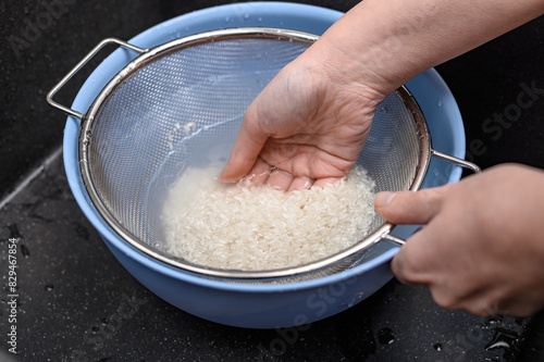 Płukanie ryżu z nadmiaru skrobi w misce z wodą