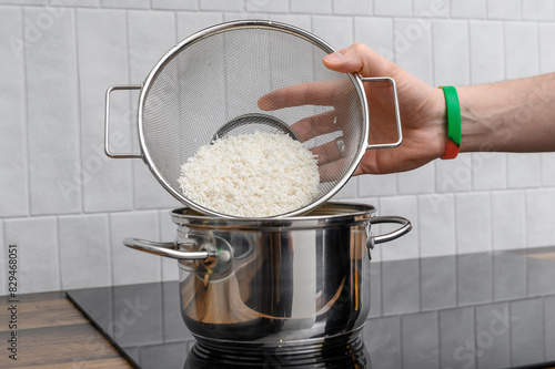 Gotować ryż, sypki ryż biały wrzucany do garnka