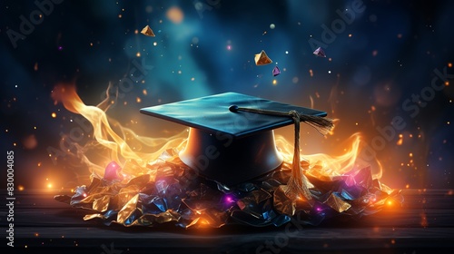 Graduation cap with glowing magical splashes, fantasy style, illustration, enchanting atmosphere 8K , high-resolution, ultra HD,up32K HD