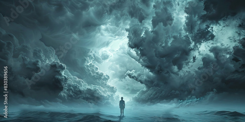 Resilience Amidst Turmoil: A strong and steady figure standing resolute against the backdrop of raging storm clouds, symbolizing the indomitable spirit of perseverance and endurance in the face of adv