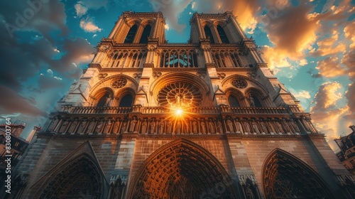 Showcase the grandeur of a historic cathedrals facade at golden hour, highlighting intricate stone carving intricate stained-glass windows