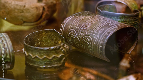 Antique bronze age bracelets in museum behind the glass. Stock footage. Close up of antiques.