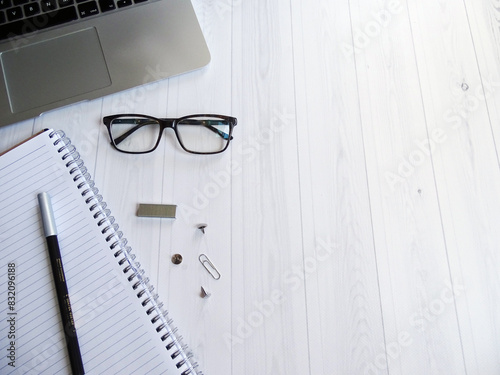 Stanowisko do nauki i pracy zdalnej: komputer, otwarty notes i przybory piśmiennicze na jasnym tle