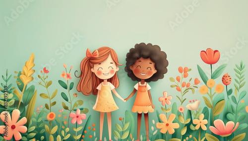 Cartoon Illustration of Two Happy Girls Holding Hands in Flower Garden.