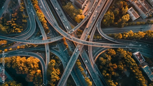 A cityscape with many roads and a lot of traffic. The roads are connected by many bridges and the sky is orange