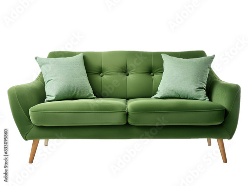 A green sofa featuring two pillows placed, isolated on transparent or white background
