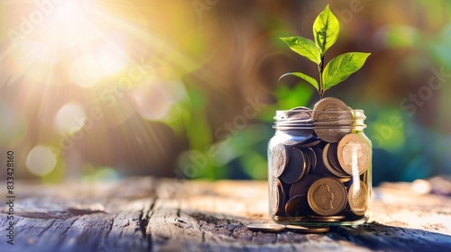 A glass jar filled with coins has a plant growing out of it, highlighting the importance of saving money