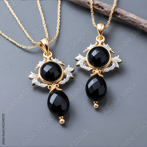 Dwa naszyjniki z onyksu i złota na kryształowych koralikach