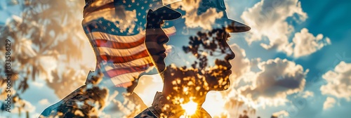 USA independence day flag and soldiers close up, focus on, copy space Vivid tones, Double exposure silhouette with military tribute