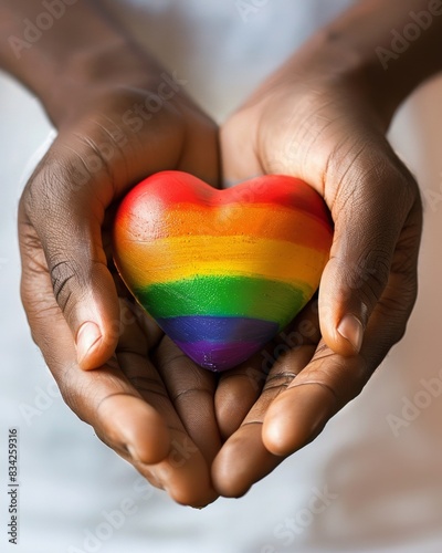 A person's hand delicately holding a rainbow heart. which is a symbol of love and acceptance