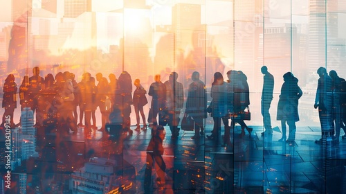 Double exposure image of many business people conference group meeting on city office building in background showing partnership success of business deal. Concept of teamwork