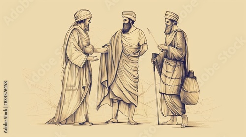 Biblical Illustration of 2 Kings 5: Healing of Naaman the Syrian, his conversion to the worship of the Lord, Gehazi's greed and subsequent leprosy, Beige Background, copyspace