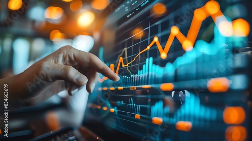 Foreground focus on economic growth graph virtual screen, businesspeople touching screen in blurred background, business investment concept, high resolution
