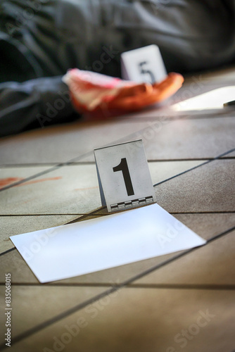 Plama krwi na miejscu zbrodni - oględziny policyjne.