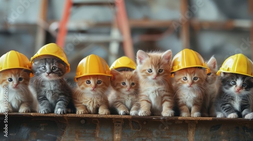Kittens with yellow construction helmets - Five cute kittens with yellow helmets at an industrial construction site