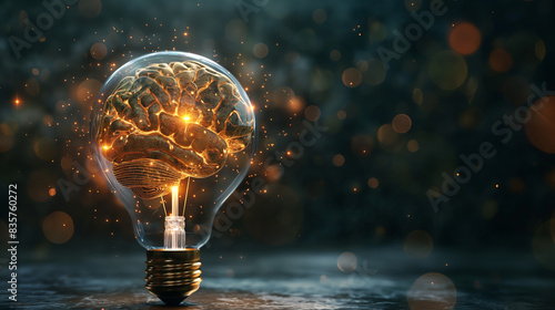 Human brain inside a light bulb brainstorming ideas idea or understanding Creative inspiration and innovation 3D bright business