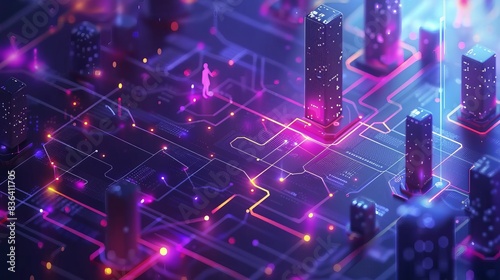 An isometric modern illustration of an artificial intelligence or neural network concept. A robot and a woman are standing on a neural network background.