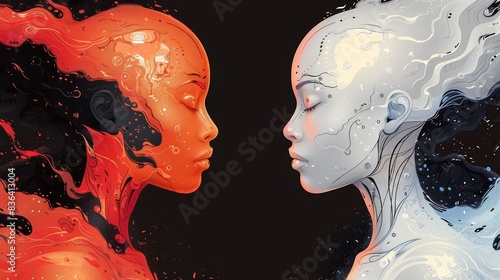 Human VS Artificial Intelligence flat illustration with a robot on one side and a human on the other laid out opposite each other on a technical background with natural elements