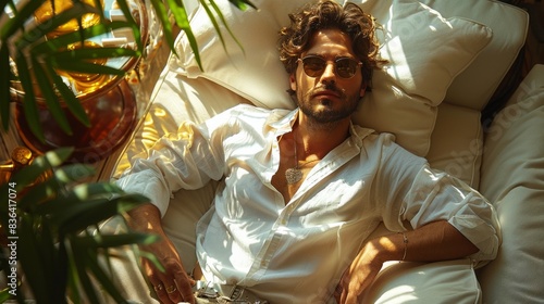 View of a tired mover relaxing on a white sofa next to a glass table from a high angle
