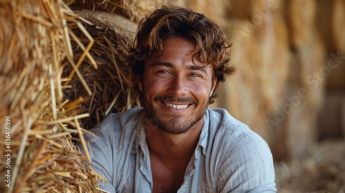 A handsome young farmer (student) sitting on haystack and smiling happily. Concepts: clean air, ecology, agriculture, hay, farmers, successful people, business.