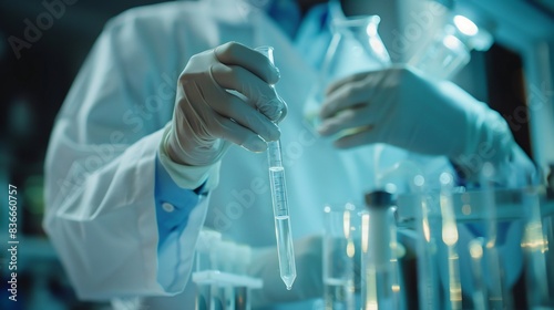 Close-up of the doctora??s hands holding a glass pipette and a water sample.