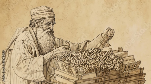 Biblical Illustration of the Parable of the Rich Fool: Man Planning to Build Bigger Barns, Beige Background, Copyspace