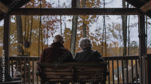 Elderly couple sitting together on porch swing, one partners onset of Alzheimers straining their lifelong bond and future