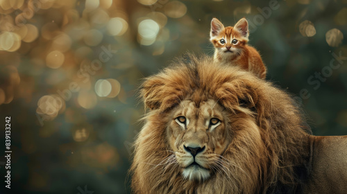 A lion and a kitten share an improbable moment in an enchanting autumn forest.