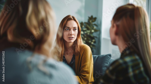 Engaged in a candid discussion, a woman attentively listens amidst a gathering of friends.