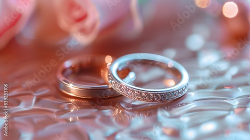 A pair of wedding rings, one rose gold and the other silver, placed on an elegant table with soft lighting. symbolizing love and commitment in the wedding ceremony.