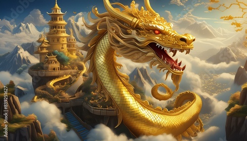 Firefly Majestic zodiac golden dragon naga with many tresure,hyper realistic,depth of fild,beutiful