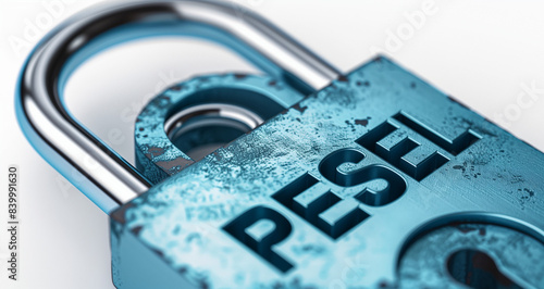 Otwarta kłódka z napisem "PESEL", styl ilustracji wektorowej, proste linie, niebieska kolorystyka, wysoka rozdzielczość, białe tło