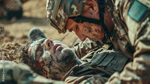 A soldier evacuates a wounded comrade, emphasizing themes of camaraderie, bravery and the harsh realities of war.