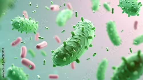 Microscopic view of various bacteria floating in a green gradient, showcasing the intricacies and details of bacterial structure.